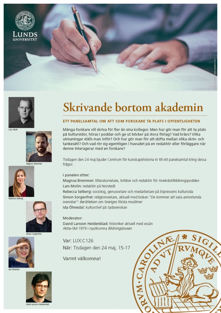 On the 24th of May, LUCK invites all interested to take part in a live panel discussion in Lund about these issues. The theme is “Writing Beyond Academia” and the discussion will be held in Swedish (and recorded as a podcast).