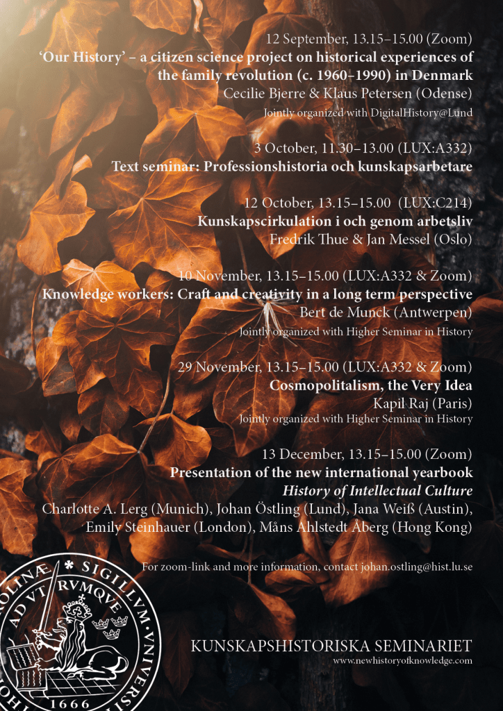 The Lund Centre for the History of Knowledge (LUCK) will offer a seminar series this autumn and we are very happy to invite you to join us.
